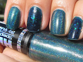 Across the Universe is a drop-dead gorgeous glitter bomb. It's a dark blue base full of blue shimmer and hexs in green and light blue. It applied perfectly, no sparse glitter, no digging for hexs, and it went on smoothly with no dragging. I used 1 layer of top coat to seal it all in and make it uber shiny.