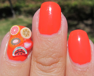 I thought it would be fun to try something new with this mani. A while back my friend Gina from My Dirty Little Obsession sent me some fimo fruit. I've never used this type of nail decoration and it seemed the perfect match - neon bright orange plus juicy fruit! After I put on a layer of topcoat I just stuck the little pieces on my nail where I wanted them to go. Then I put a couple layers of topcoat on top of the fruit pieces. I've been wearing this all day and so far all seems very "stuck" in place.