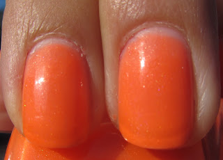 Orange, neon, sheer, jelly, shimmer. These are the words that best describe Princess Polish Orange Marmalade. When I put it on last night I wasn't really feeling it. It seemed too neon and sheer for my taste. But looking at my pictures of it out in the sunlight I think it's really quite pretty.