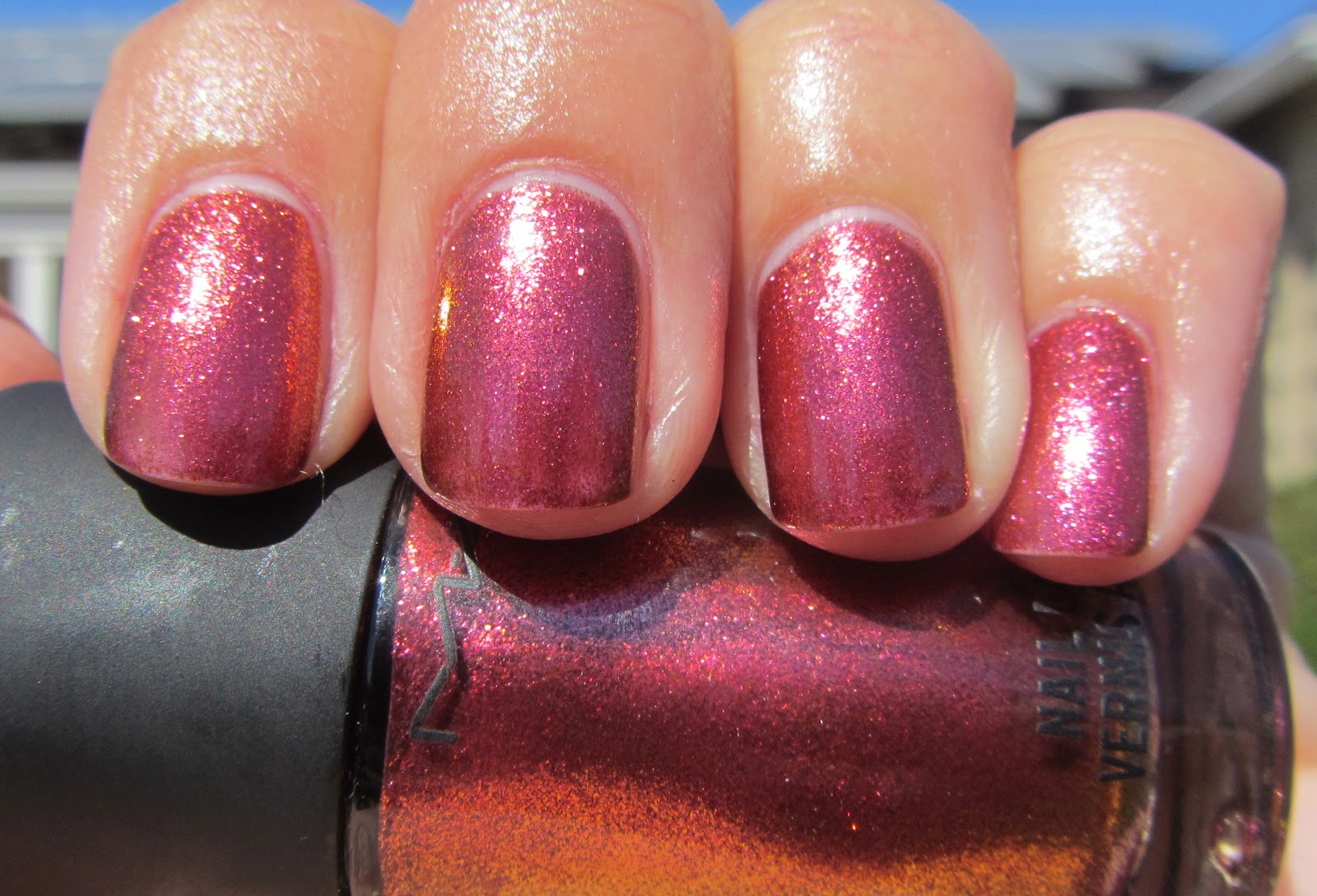 Now, the review. Bad Fairy came out with the MAC Venomous Villians collection, Fall 2010. Bad Fairy was the one polish everyone was going ape-sh*t over and I now understand the noteriety…it is GORGEOUS!! Such a beautiful polish. BF is an amazing color shifting duo chrome with shimmer. I like this type of duo chrome so much more than ones like the China Glaze New Bohemians - which end up looking flat and streaky IMO. The extra "texture" really adds something to the color shift. Bad Fairy is a magenta polish that shifts to a raspberry red, to a coppery orange. I wore BF on it's own and it took 3 coats for full coverage. I probably should have used a 4th coat but didn't want to waste the polish. The brush was the teensiest but wonky but not hard to work with. The sheerness and brush aside I adored Bad Fairy. It's an absolutely stunning color that I plan to rock again this Fall.