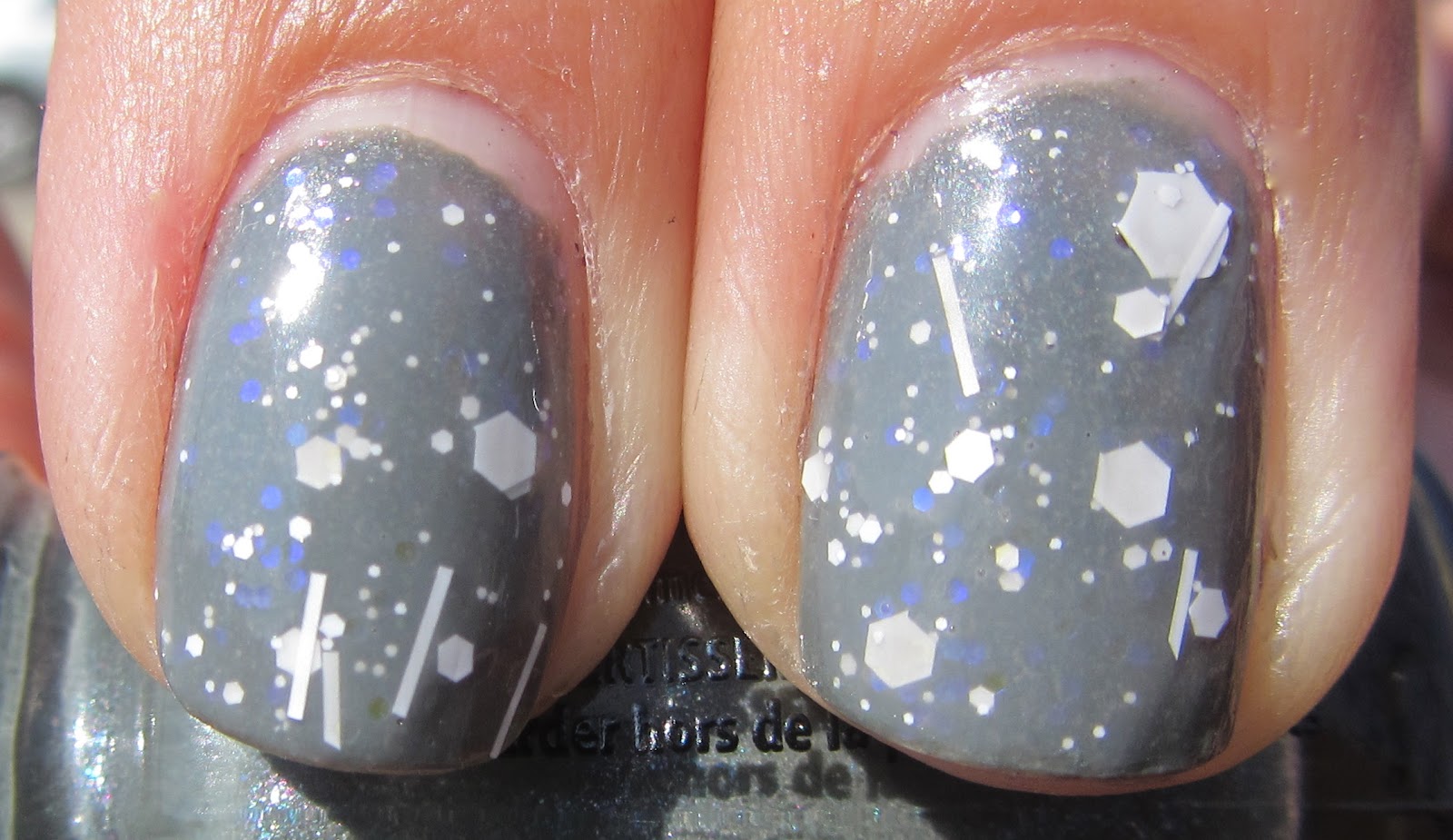And now CrowsToes Bone Daddy. I love the name (nod to Nightmare Before Christmas hero Jack Skellington), I love the theme and I love the color/glitter combo. Bone Daddy is a light grey tinged base full of white matte glitters. They vary in size and shape - bar, hexs, micro glitter. There is also a sparse sprinkling of a glowy royal blue glitter and some glowy yellow glitter. The blue does show up on the nail but I did not notice the yellow. The blue glitters have an ethereal feel about them which I think is perfectly fitted to the polish. The grey base didn't seem to change the color of Immortal. The glitters were quite easy to get o the nail - no fishing, no placement needed. A plenty good assortment came out with each dip of the brush. I used 2 coats of Immortal, followed up by a coat of Gelous and then a coat of top coat.
