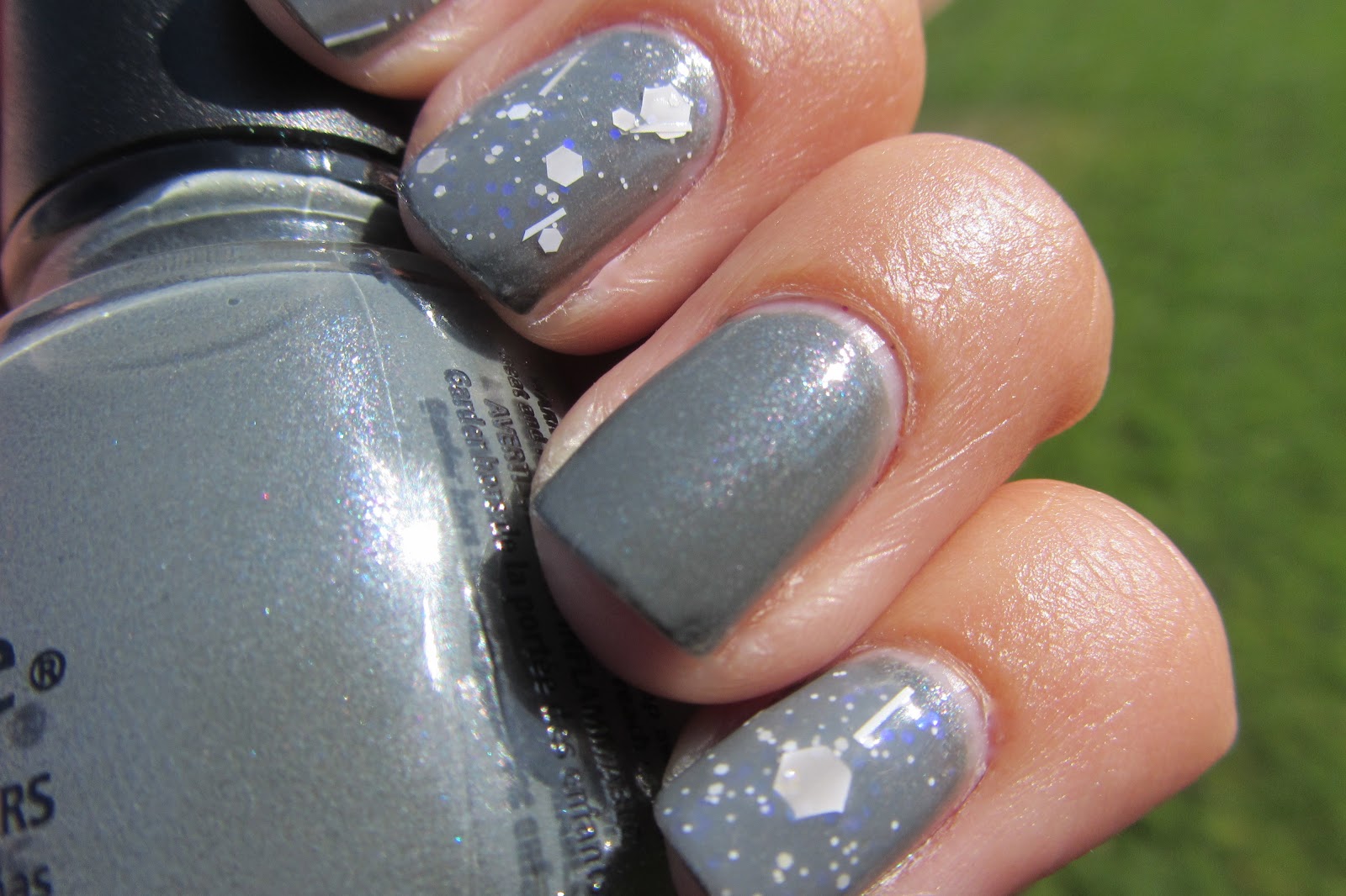 I'll start with the base/undies: China Glaze Immortal. Immortal comes from the Wicked collection that was recently released. Immortal is a gorgeous medium grey with silver micro flecks and pink and blue shimmer. It applied smooth and easily. I used 2 coats for my full mani, then went back and added a 3rd coat to my ring finger nails to ensure that it was fully covered. Very beautiful and unique color in my collection.