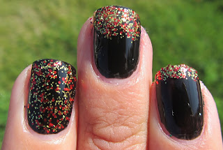 I then used Pumpkin Spice which came in a grab bag purchase from my friend Hazel. PS is a clear base with red and yellow hexs (why no orange and the name pumpkin is totally beyond me). But it is still very appropriate for Fall and Halloween. I used 1 coat on my ring finger nail and sponged a "gradual gradient" on my other nails. Of course the idea of a gradual gradient was much cooler in my mind. Now it just looks like I sponged less on my index finger nail than the others. Oh well, live and learn. PS was very easy to work with and I did get a large amount of glitter with each brush dip. I used a layer of topcoat to finish up this mani.