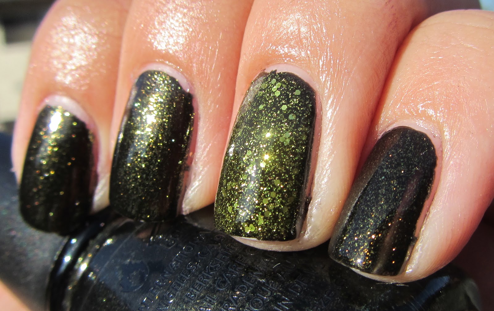 First I used 2 coats of China Glaze Cast A Spell from the 2012 Wicked Collection. CAS is a very dark hunter green polish with gorgeous glimmer (glitter-shimmer) that sparkles so much in the sunlight. It really reminded me of a mani I did last month using China Glaze Wagon Trail and Ninja Polish Zultanite - you can see it here. CAS seems to be a very close color but more sparkly. The formula on this was fantastic, almost a one coater and definitely one of the most gorgeous colors I've worn so far this month. I didn't have any problems with streaks or patchiness, just smooth and even application.