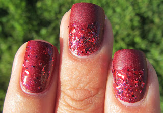 I then used Sonoma Nail Art Deadly Zins for accents. DZ is a clear base polish chalk full of bright red hexs, red micro glitter and a smidgen of tiny black hexs. I sponged DZ on my nails near the cuticles and used 1 coat of regular application on my ring finger nail. I had plenty of glitter come out and it spread evenly on my nails. I did not use Gelous or topcoat because I wanted to keep the matte look.