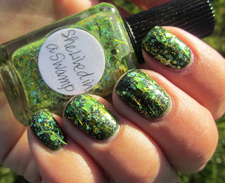 I then used 2 coats of Lynnderella She Lived In A Swamp (SLIAS). The glitter in this polish is amazing, so pretty! It's lime, chartruese and gold. Different shaped glitters and micro-fun! It went on well with only one noticeable problem. The glitter tended to clump a bit so I had to spend a little extra time spreading it all out. But tons of glitter came out with each brush dip, no fishing necessary. No curling or lifting glitters either.