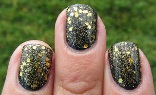 But I digress, back to The Captain, the polish. Hello golden beauty! TC is a wonderful mix of different sized gold hexs and micro glitter. It went on smoothly, with loads of glitter coming out with each brush dip. TC lay flat and was smooth with 2 coats of topcoat.