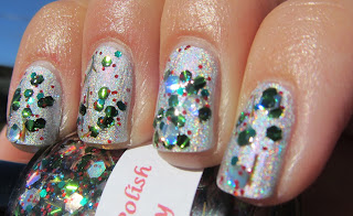 I then used DDP Frah-zhee-lay.  What a fantastic glitter bomb!  It's full of huge silver holo hexs and different colored and sized green hexs.  There are also small red and green hexs and gold holo bars.  It's a bling-tastic combination.  I used 2 coats and had a good amount of glitter come out with each brush dip.  I didn't have to fish at all for any of the larger glitter pieces.  I will warn you that the green hexs didn't all want to play nice and I have to push a few down.  But with that and 2 coats of Gelous my nails were smooth.  I also used a layer of topcoat to keep it shiny (like it needed it with all that holo going on).  As an added bonus this polish is scented.  It's hard for me to place the scent, but it's not overpowering.  It's quite pleasant actually - slightly reminiscent of soap and berry.  The scent remains after drying.