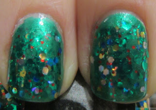 I used 2 coats of Catrice Virgin Forest, a very bright kelly green (trust me when I say the pictures do no justice to the brightness or the glittery bling on this mani combo). I topped it off with 2 coats of CrowsToes Jingle Balls. Jingle Balls is mostly green hexs, but there is also blue, red and gold and gold bars and stars. Festive, right!?