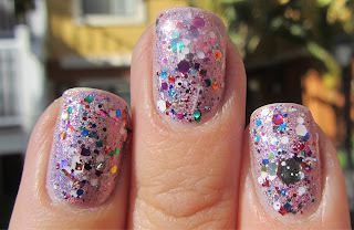 Big hoopla night for nail polish lovers around the world! What kind of art, design, style or combination will we all wear? I'm enjoying all the pictures posted on Facebook and Instagram! Lots of bling, lots of sparkle! As it should be! I went for a multi colored glitter by Lynnderella called Pentimento. It's a totally gorgeous mixture of shape and color and it reminded me of falling confetti. I layered 2 coats of Pentimento over 2 layers of Color Club Cloud Nine, a soft purple linear holo. Survey says? They are a perfect pair! Since I'm not at home and only brought topcoat (really needed my Gelous today), I had to use 3 layers of topcoat.