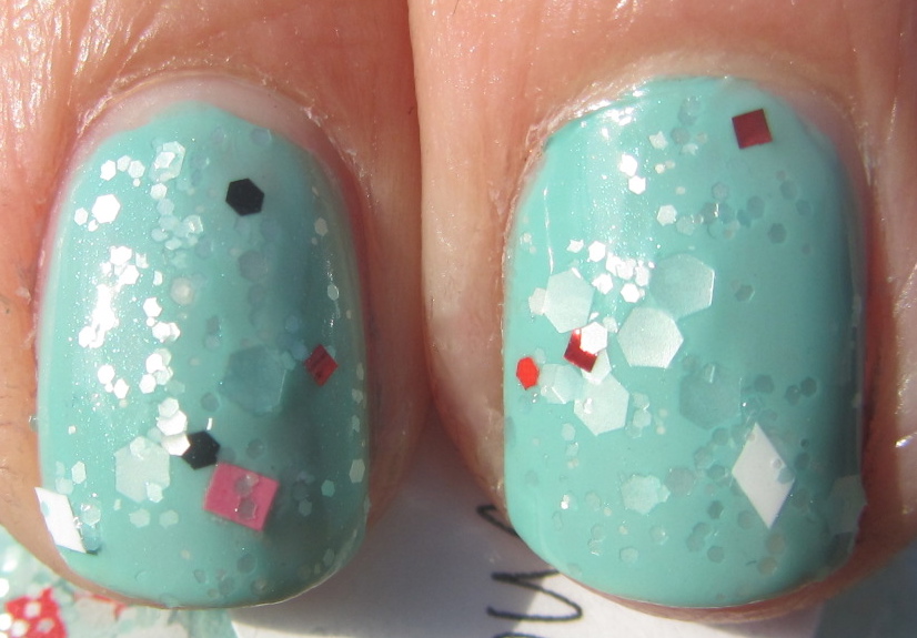 I started with 2 coats of Cliche Cancun. Cancun was a gift from my friend at Miminhos Que Eu Gosto, thank you Dulce! It's a gorgeous light mint green colored creme polish. I used 2 coats for nice coverage...and the perfectly matched undies for Spumoni. Spumoni was released with the Season's Glitterings collection and though it was put out as a holiday color, I think it's fun for any time for the year. Spumoni is described as "full of frosty mint and white satin glitters as well as a sprinkle of red, pink and black in a translucent mint base. I specifically saw diamonds, squares and hex shaped glitters. Application was really good - lots of glitter came out with each brush dip and they spread well on the nails. I finished it off with a layer of topcoat.