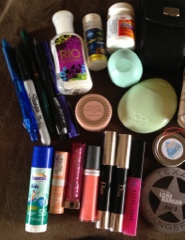 Now the embarrassing inside. So much junk. So much unneeded stuff. Diapers, wipes, boogie wipes, wet wipes, lipgloss assortment, pens, lotions, glasses, etc. The random Lone Ranger buttons and masks are from our trip to Disneyland last weekend where they had a red carpet event for the world premiere. I shook Johnny Depp's hand, are you jealous?