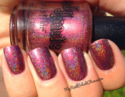 This is Love Affair.  I love it!  It's an amazing color with an amazing formula.  I have one ONE coat!    Love Affair is a dusty red with some mauve undertones.  It's not too bright and not too deep, just a perfect every day shade.  Then there's the holo.  Its gorgeous!  It's almost a hybrid between being linear and scattered - can it be both?  Sure why not!  The formula was smooth and creamy and applied like butter.  I used 1 layer of topcoat and I think it made the holo even better!