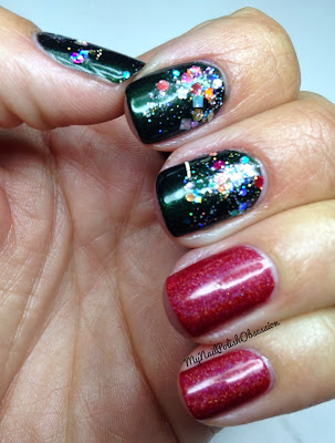 First I used Wet n Wild Poison Ivy. Yes I know it's from the 2012 Halloween collection but I adore this color! Such a gorgeous deep hunter green with the same tone shimmer. I used 2 coats on my thumb, index and middle fingers. The formula on this polish is amazing. The wide brush is excessively wide but I don't let it hinder my love for the color and formula. Once dry I sponged Lynnderella Season's Glitterings. Season's Glitterings is from the 2012 holiday collection and it's a fabulous glitter topper with "multiple shapes and sizes of silver, gold, green, blue, red, purple and pink holographic glitters." Wow the holo goodness in this is amazing! I sponged on 2 layers and really want to wear a full mani with SG after this little tester! I then used Smitten Polish Zelda's Fall-ly on my ring and pinky nails. Such a gorgeous linear red holo! This is from the Turning Leaves Tree-O and is no longer available. Application and formula of Zelda's Fall-ly are both amazing. 2 buttery coats for full coverage. I used topcoat to finish this mani.