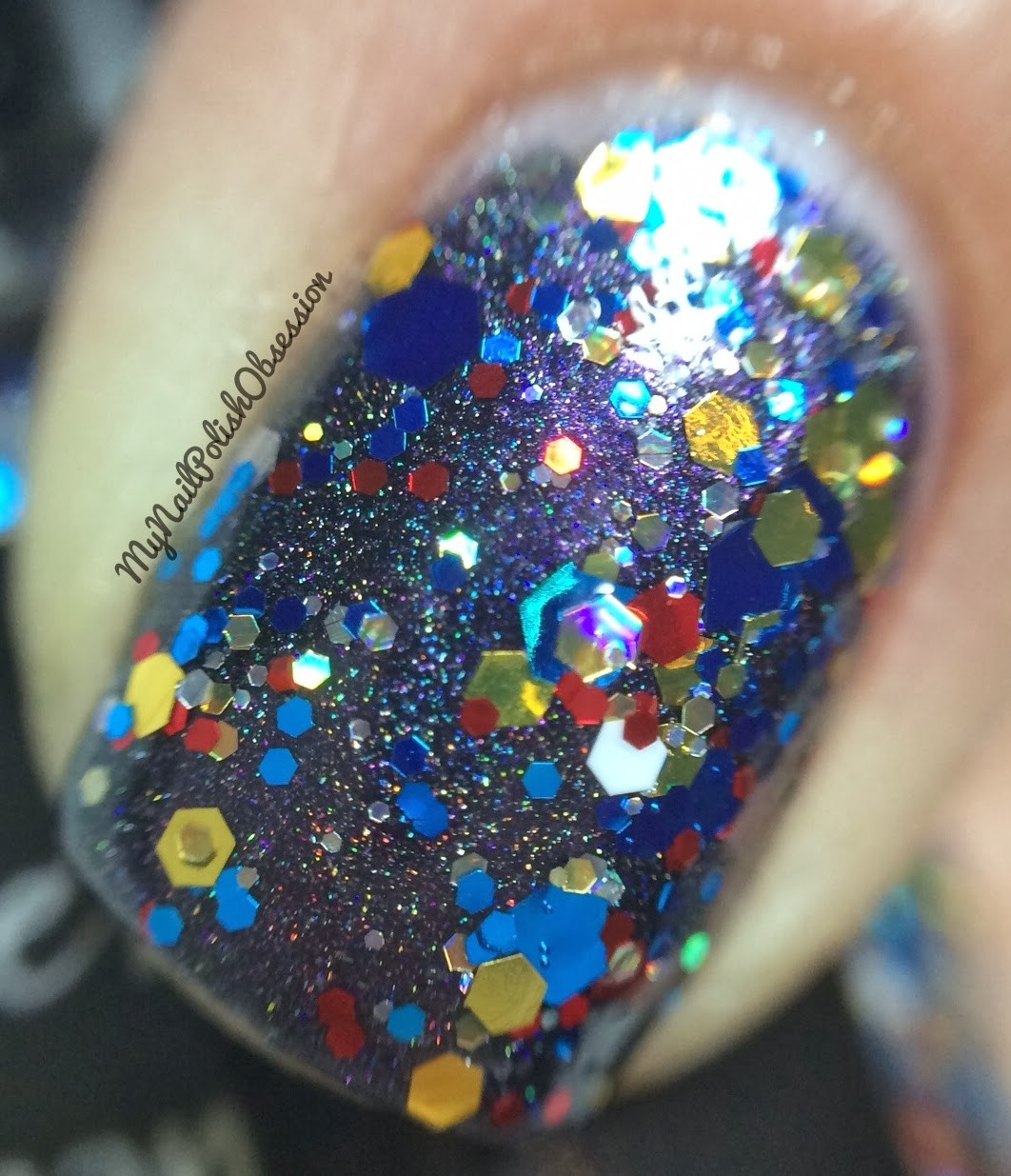 And bringing up the end of the post is the fabulous Wonder Woman! Wonder Woman is from an unnamed collection that debuted in the summer of 2012. Wonder Woman is a fun mix of gold, white, blue and red glitters in a clear base. The colors perfectly represent the character. I found that the glitters were all smaller in size and they were very easy to get out of the bottle. Each brush dip provided me with a plethora of glitter that spread easily and evenly on my nails. This baby is super sparkly! I used 2 coats of Wonder Woman over One Trick Pony. I finished with 1 layer of topcoat. *side note - Wonder Woman was discontinued and has since been replaced by an updated version called My Favorite Amazon.