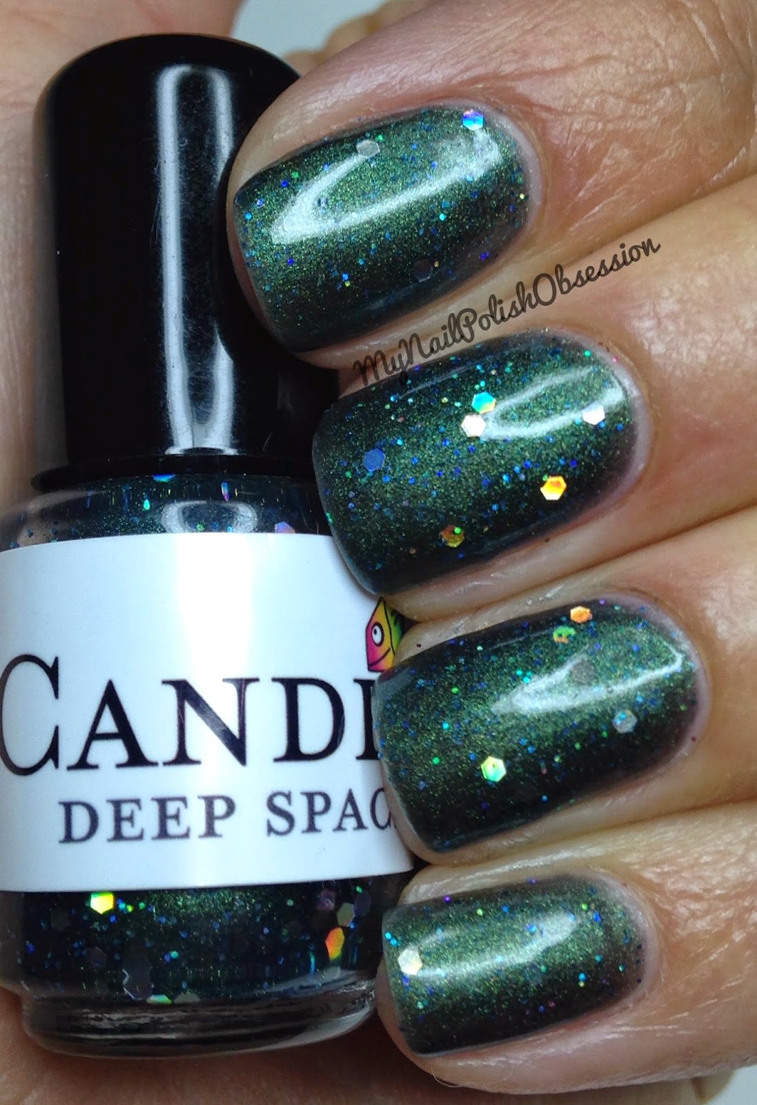 Deep Space is amazing. The end. Ok really. Deep Space is described as a "semi sheer base that is a deep green, but under certain lighting conditions will color shift to blue/purple. It contains micro teal glitter and a light sprinkle of large diver holo hex glitter." This polish has real depth to it and I found myself gazing into my nails while I was wearing it. Like the description said, it was a bit sheer, but the formula and application were both great. I used 4 coats of Deep Space and 1 layer of topcoat.