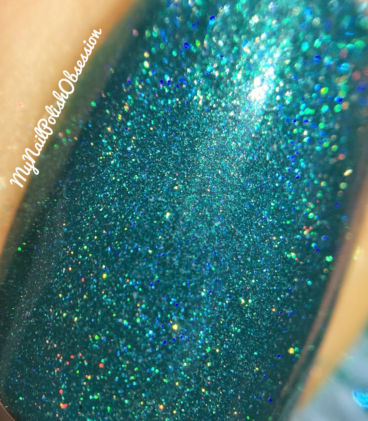 Esther from Philly Loves Lacquer brings us Rain Boots and Puddles, a "blueish teal linear holo with blue flecks and shimmer." This is such a pretty teal, so bright and happy for a polish inspired by rainy days! I actually think this will be a great teal for days out at the beach this summer. Rain Boots and Puddles is full of glinting holo particles and blue sparkles. The formula was lovely and full bodied. It applied nicely too. I used 2 coats and no topcoat.