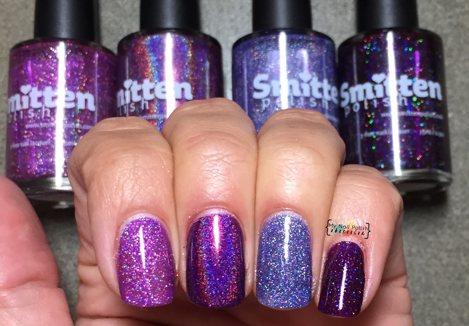 Something Wicked This Way Comes is a totally unique finish amongst my Smitten collection. I have no other with that fine holo glitter added to the holo base. So I pulled other purple shades of different finish just so you could see how the colors compare. I've got Sparkling Orchid on my index, Something Wicked This Way Plums on my middle, Jellyfish Rave on my ring and Smitten By Your Beauty on my pinky. 3 coats of Jellyfish Rave, 2 coats of all the others. Absolutely no dupes here. But aren't all those purples gorgeous?!