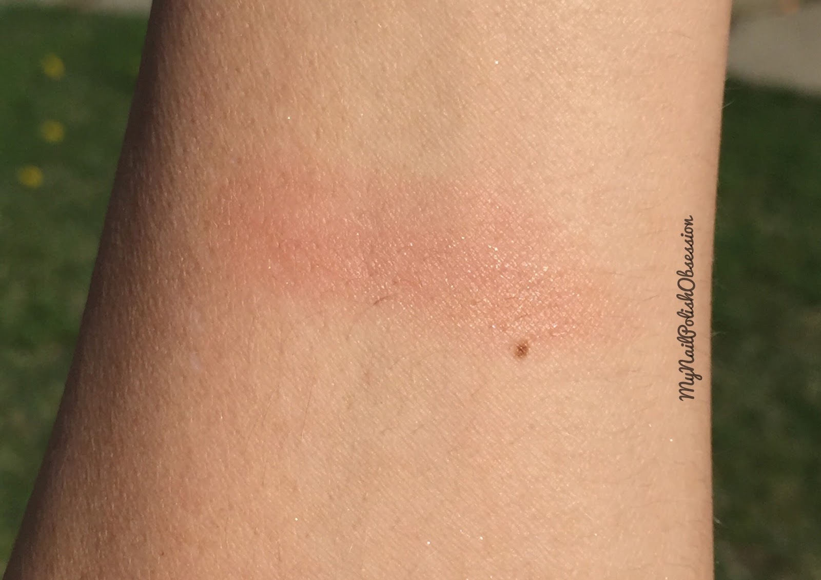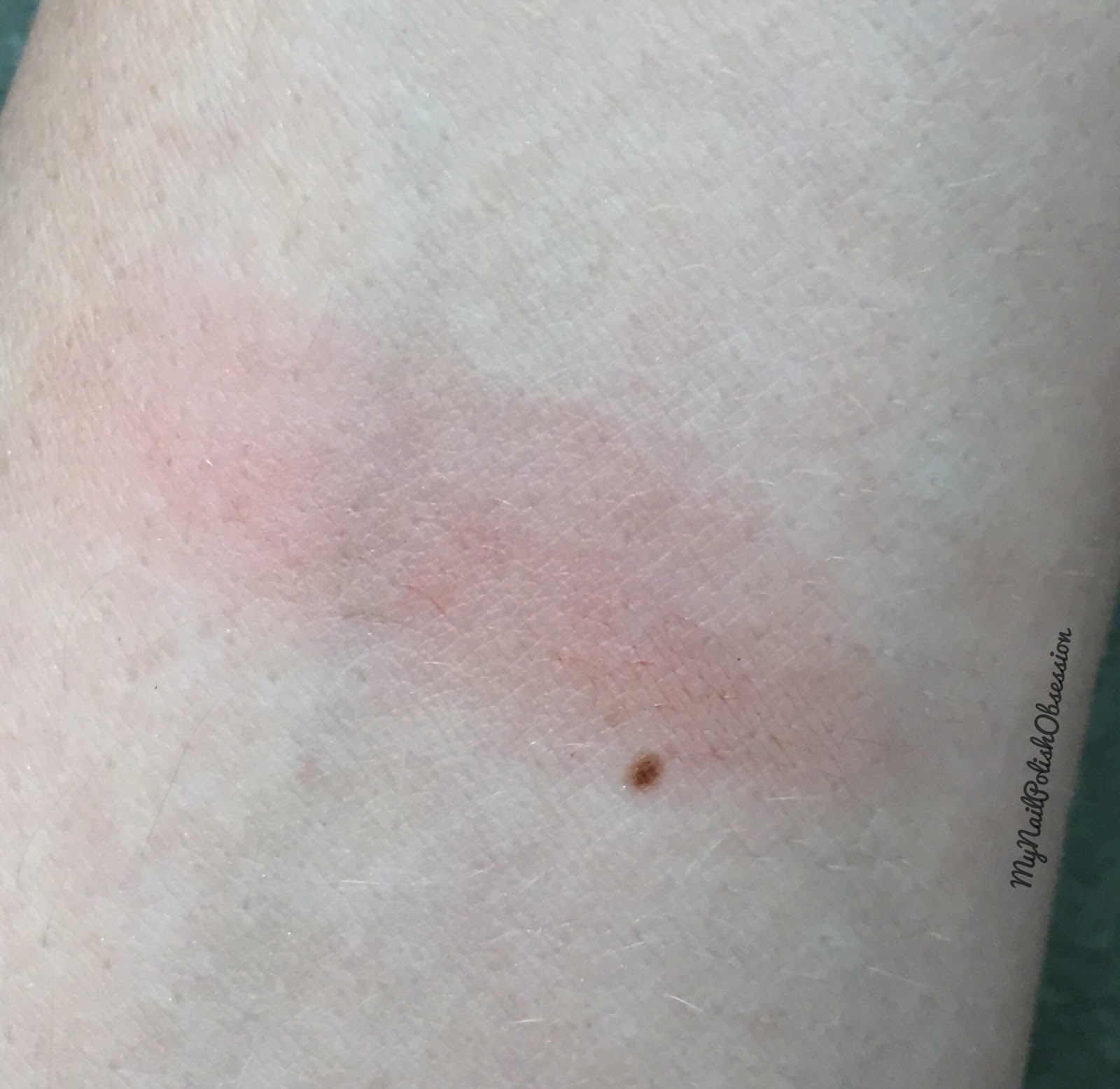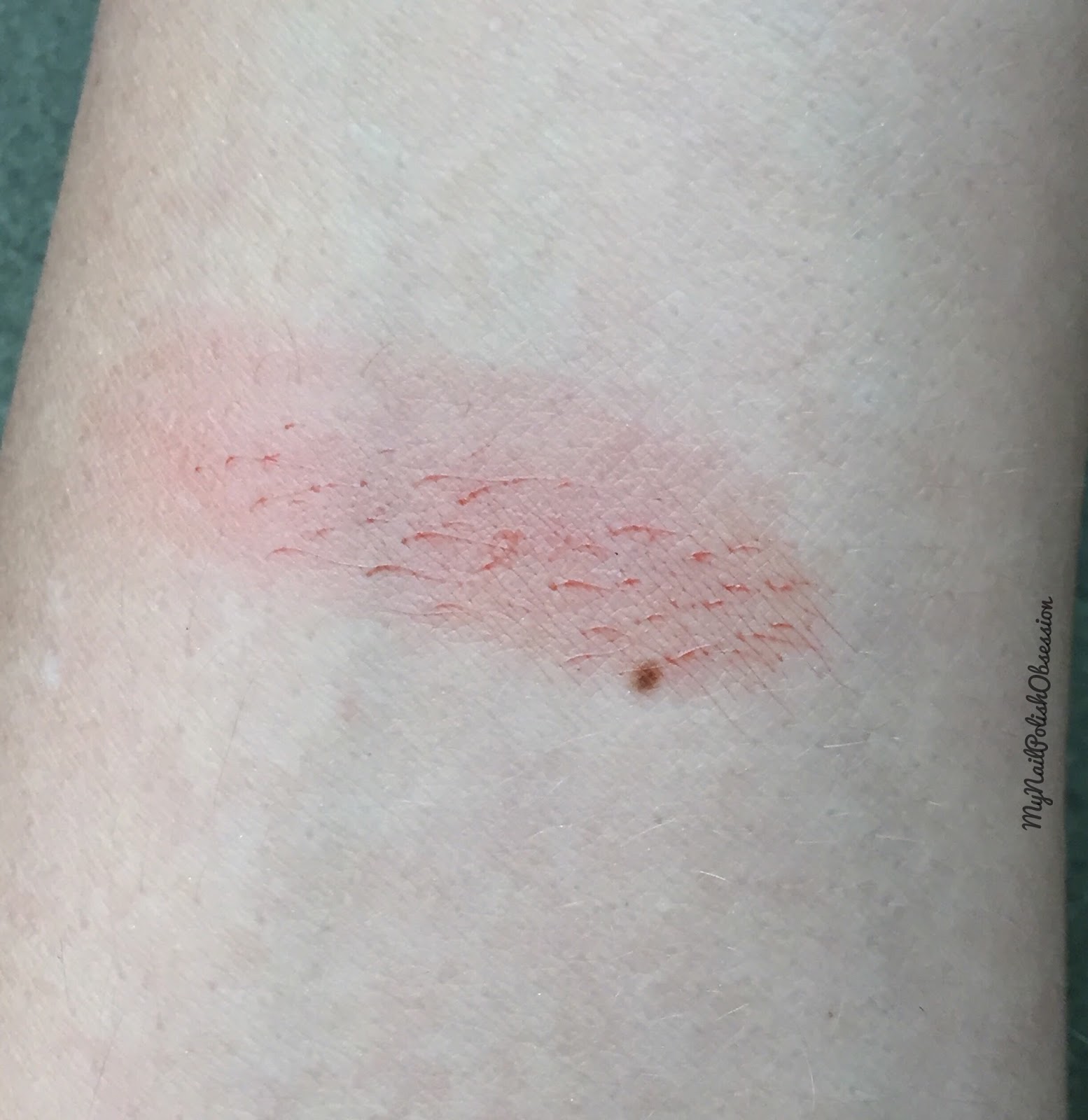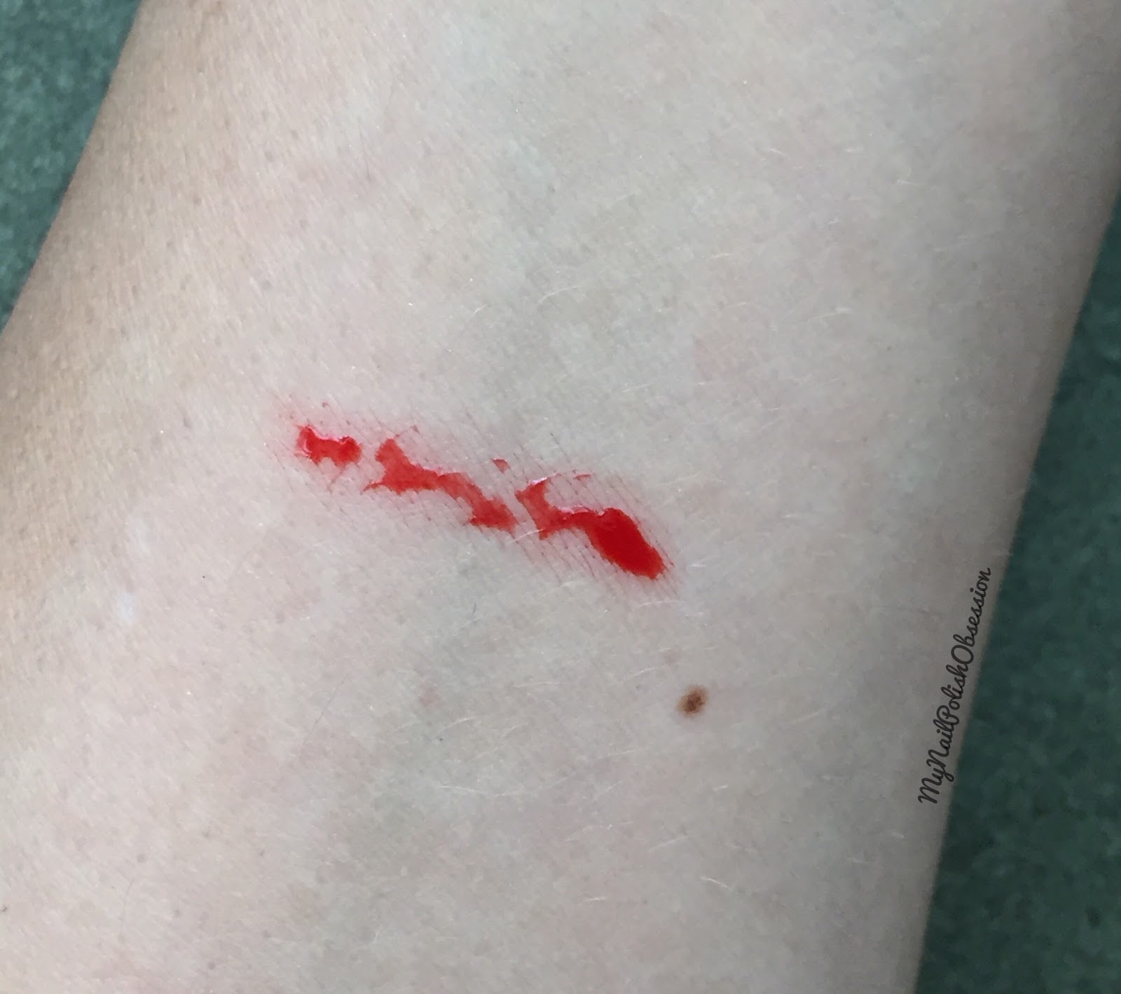 Here's Cheeky Strawberry brushed on to my arm. Looks like blood! But it's not.