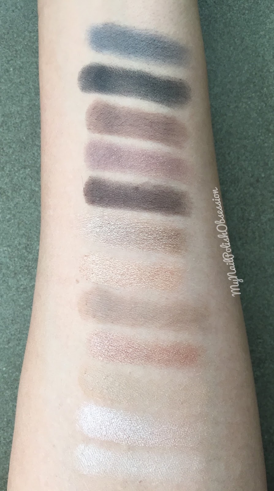 And finally, the Smokey Nude. I find that I hardly wear grey, but the lighter one is very nice and wold be perfect with a light sweep over the lid. #11, the darker grey is the only one that seemed to have a very slight application issue. It didn't glide on as easily as the other colors. You'll be able to see from the indoor swatch picture that the application wasn't fully even.