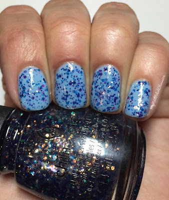 Moonlight in the Night is one of the glitter toppers in the collection. It's a mix of blue and purple and iridescent color shifting glitter. Very pretty, but hard to capture all the colors my eye could see in my pictures. I loved that 1 coat provided plenty of glitter! I have Moonlight in the Night over Don't Be Shallow. I finished with a layer of topcoat.