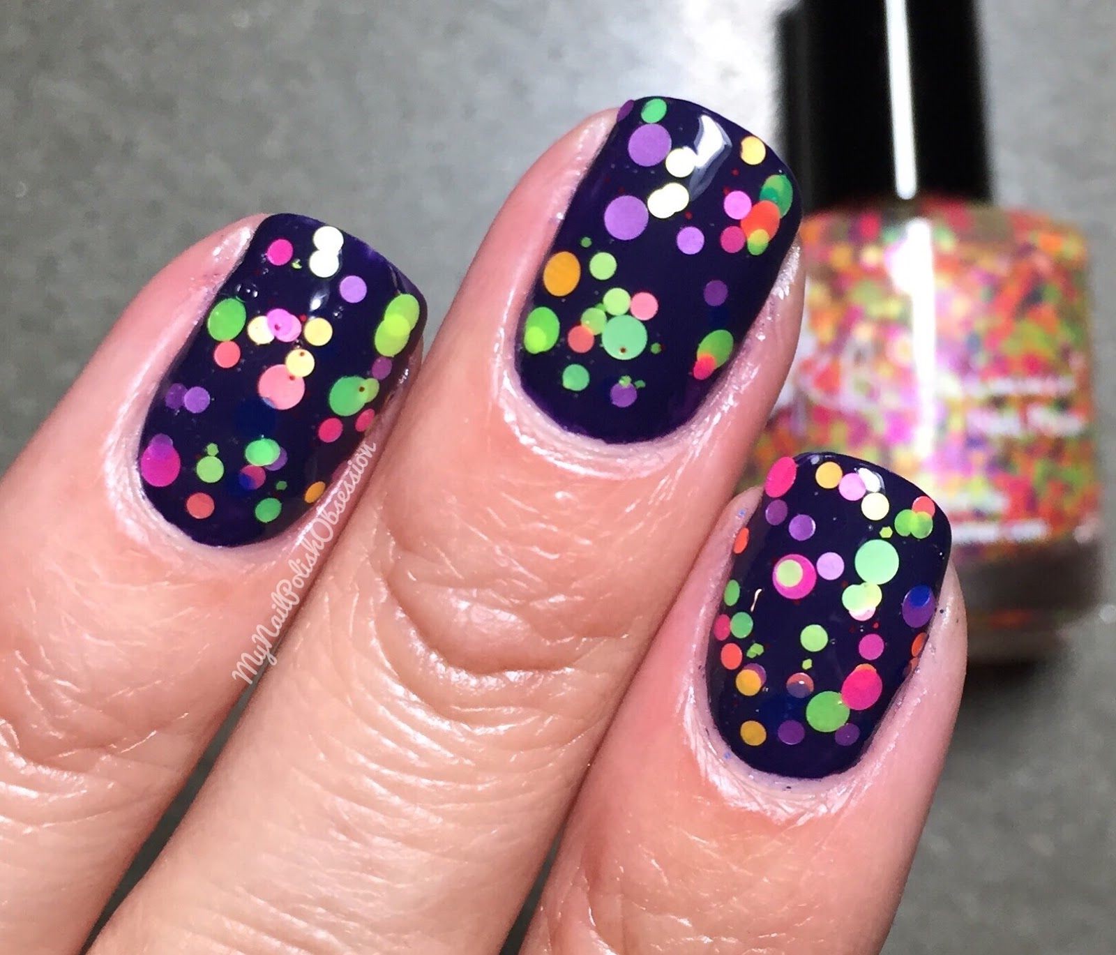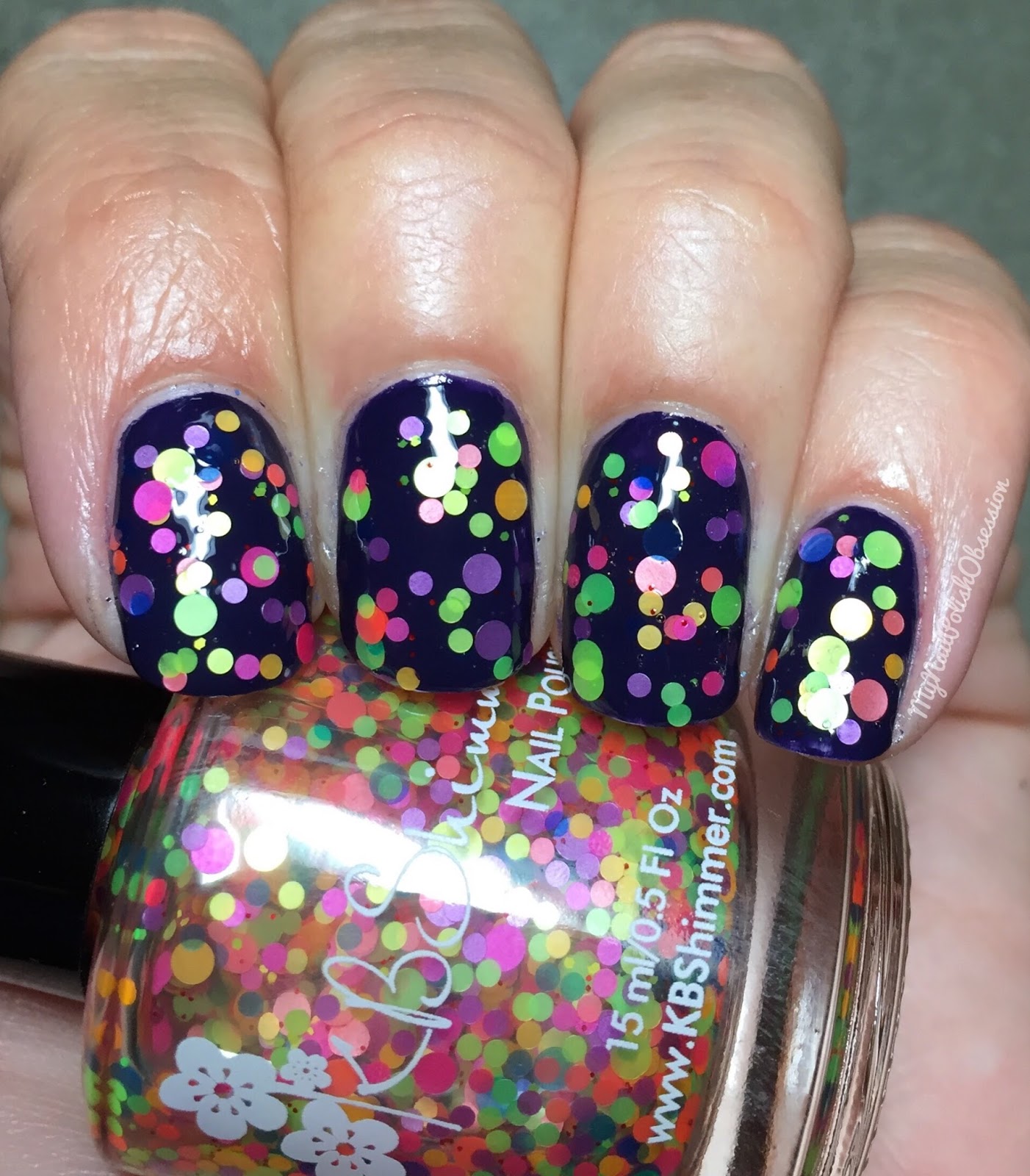 Rounding out the collection is my favorite from the Spring 2016 set. Upside Round is a glitter topper that adds a punch of color and fun to your mani. The glitters are all neon shades and different sized circles. I have seen it over white (check out Cosmetic Sanctuary's swatch of it over white in her review HERE) and when layered over a dark base, like I did you get a different look. The glitters seem darker and more vibrant. I used 1 coat on top of KBShimmer Soul Deep. I was very pleased with the glitter payoff. The glitters came out early and spread well on my nails. I finished with topcoat.