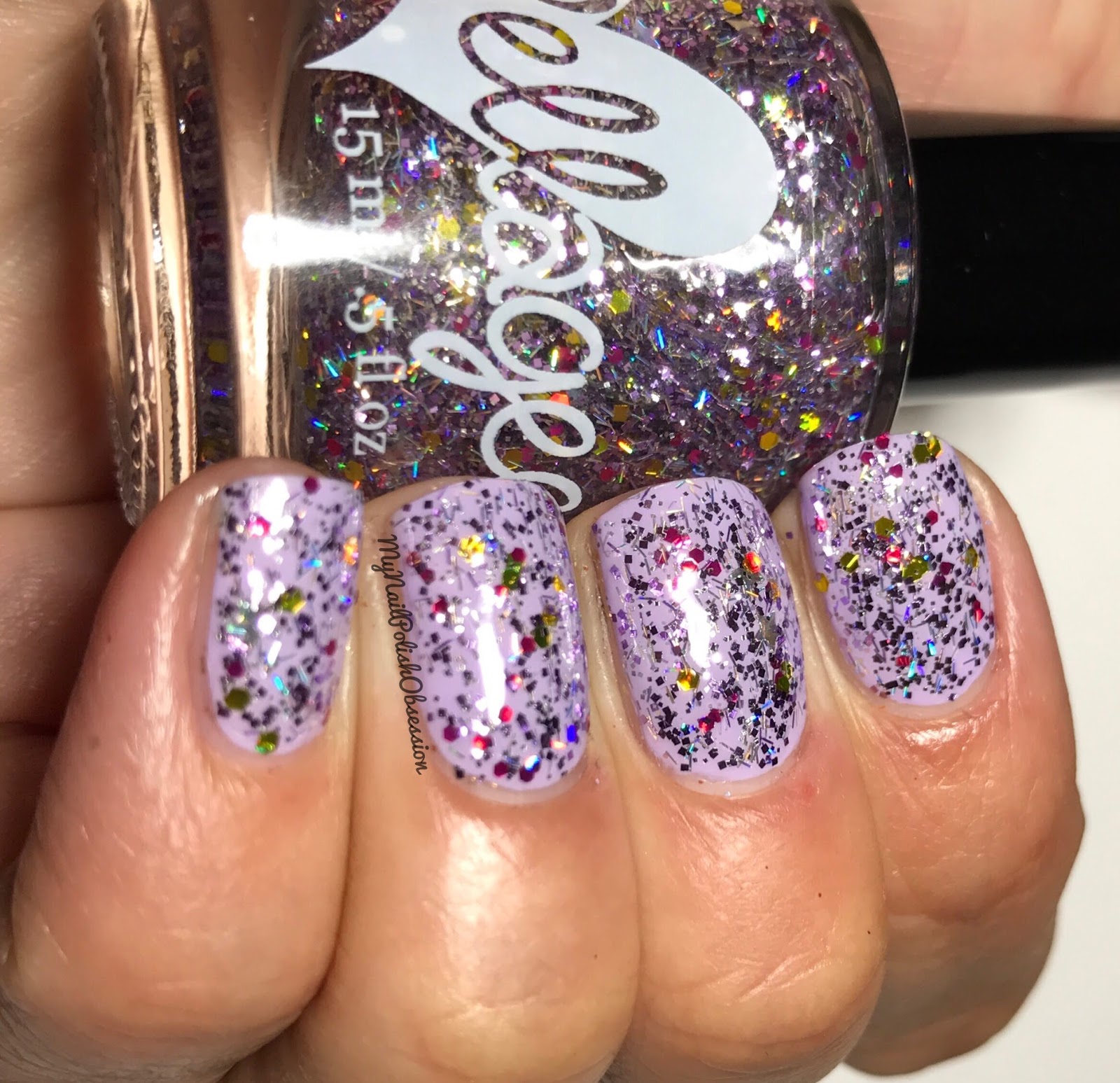 Last but not least is Monster Ball. This is a super fun glitter bomb, full of circle glitters, bars, mini stars, squares and micro glitters. I see a mix of soft purple, gold, magenta, holo. I wear so many shimmers and chameleons these days that it's fun to play with glittery goodness. I have 2 layers of Monster Ball over a soft lilac purple creme. I finished with topcoat to keep the glitters smooth.