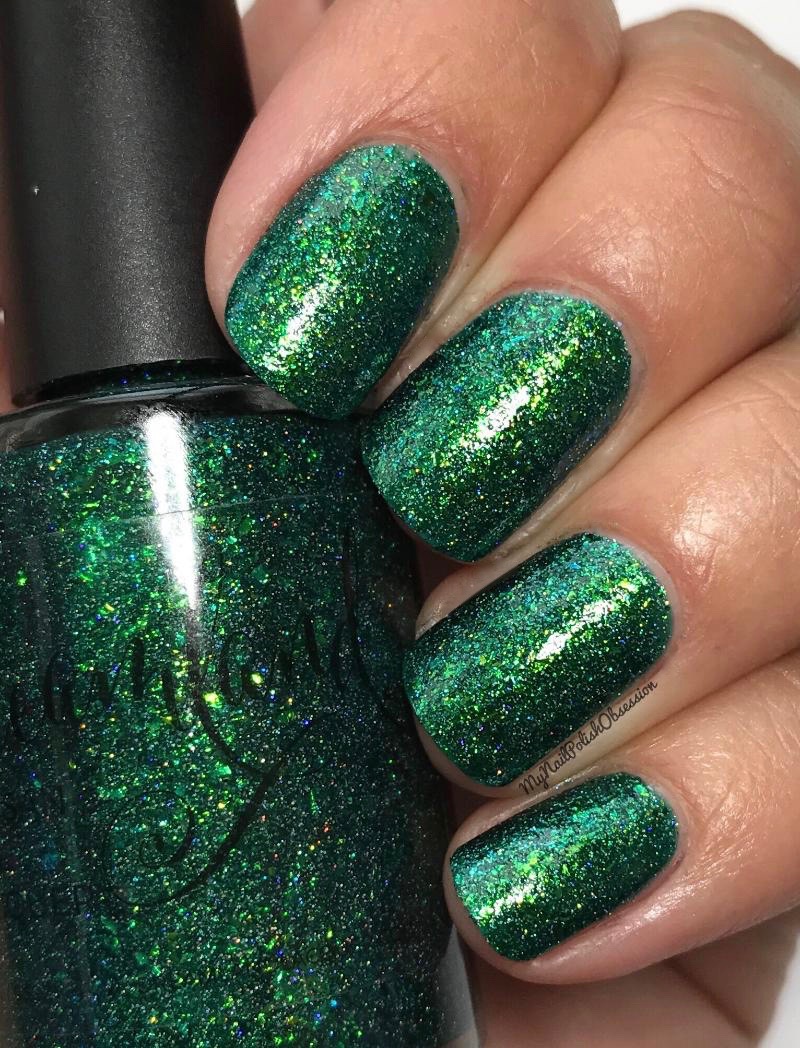 A Walk In The Woods is a green jelly base full of green to blue multi chrome flakies and holo micro glitter. So beautiful! Formula and application were both fabulous. I used 2 coats for full coverage and finished with a layer of topcoat. I did find this one (all 3 actually) to be topcoat hungry so use a couple layers or a thigh topcoat like gelous.