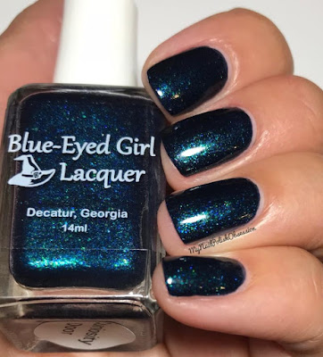 Curiosity Door is a blackened navy blue jelly with turquoise glass flecks and a green to teal to blue shifting shimmer. This is a beauty! Love the darkened color, love the pops of color. Awesome formula, awesome application. I used 2 coats for full coverage, finished up with topcoat.
