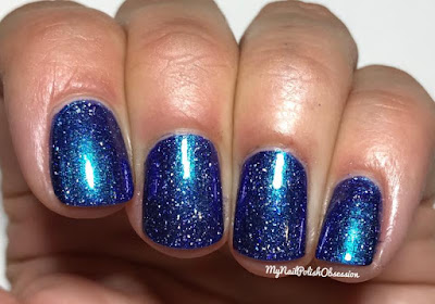 Why So Sirius? is a full on space polish. It's a beautiful navy polish with purple to teal shift and holo glow flakes. Those holo glow flakes should just be in everything, they are so gorgeous and really add a nice glowy touch to this polish. Formula and application were both wonderful. No issues to mention. 2 coats and topcoat.