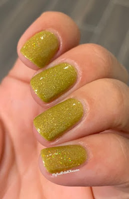 Green Tea Cake.  Did I mention how unique this shade is?  It's like the most interesting shade of mustardy green ever.  And it really does remind me of matcha tea.  Add some holo sparkle and you are good to go with some amazing nails!  Formula and application were both fantastic.  I used 3 thin coats for full coverage and finished with topcoat.