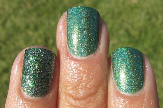 This green fellow is Lonesome George. Lonesome George is from the 2012 Objet d'Art collection. Described perfectly as a "jeweled-tone green." This color is so luxurious and amazing for any time of the year. It's holo effect almost appears to be a mixture of linear and scattered. I used 2 coats with no topcoat.