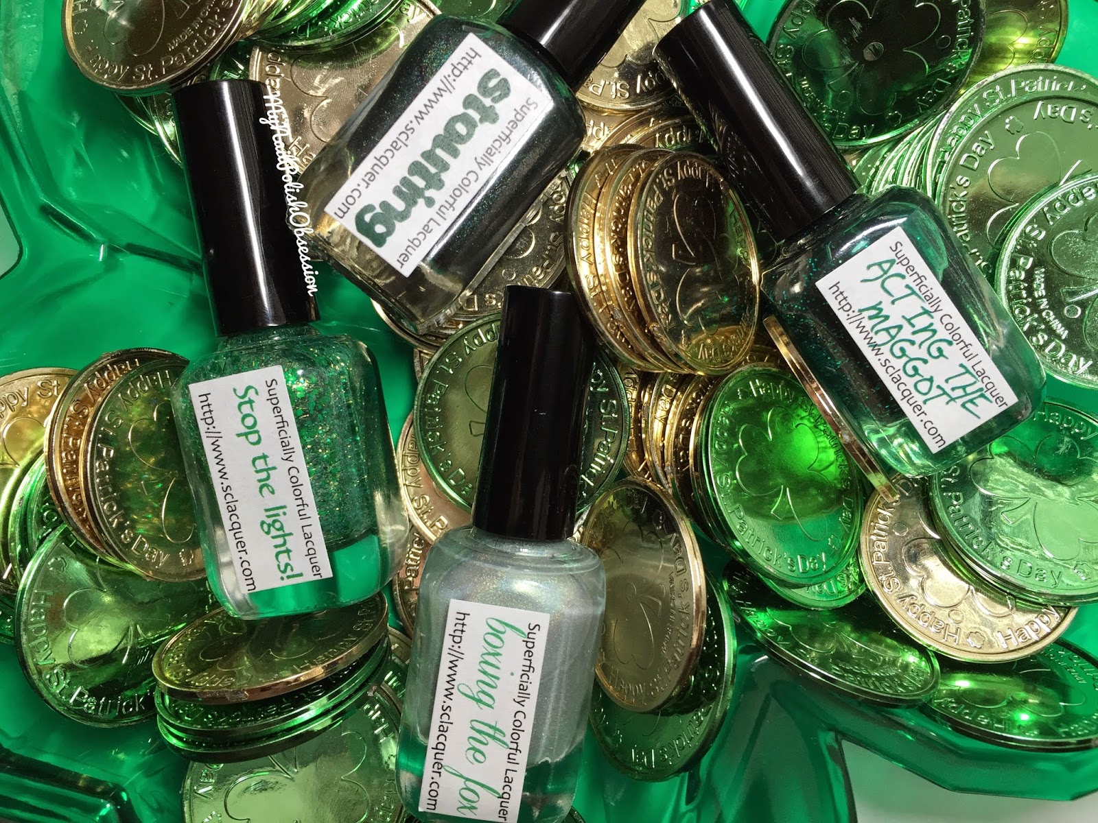 Good afternoon again lovelies! I have another fantabulous collection from Superficially Colorful Lacquers to share with you right now. This collection of green beauties is the Sham Rockin' Collection and if you love green you are in for a big treat. Sham Rockin' is of course in celebration of St. Patrick's Day. Jin shared her inspiration for the collection with me and I'd like to share it with you! "Shamrock is the young sprigs of the clover that symbolize St. Patrick's Day. In Irish slang, Sham is a friend, mate, dude. And according to the Urban Dictionary Shamrocking has several meanings but my favorite is yelling out loud and crying when you lose at a game you suck at horribly. So this is my collection: a play of shades, finishes and words based on Irish slang." The Sham Rockin' Collection will be available Saturday 2/28 at 12pm EST. They will be $9 each. I think it's time to jump in and enjoy this collection, don't you?